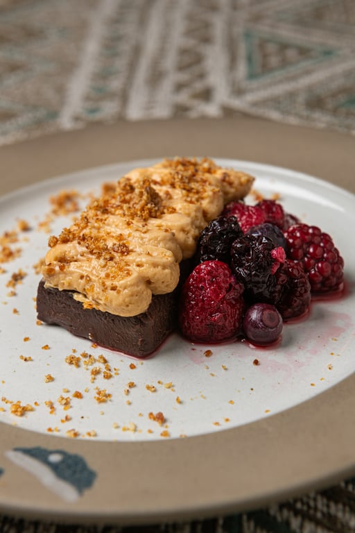 Marquise de chocolate com mousse de doce de leite, praliné de amêndoa e redução de frutos vermelhos.