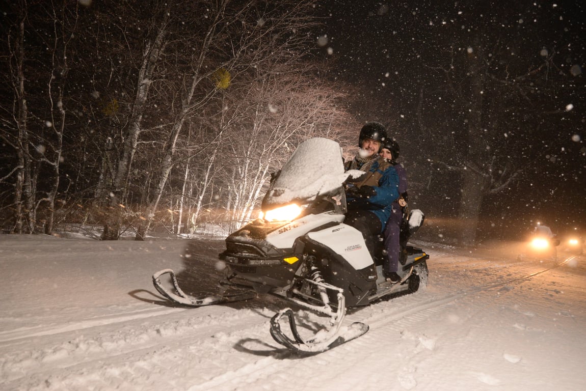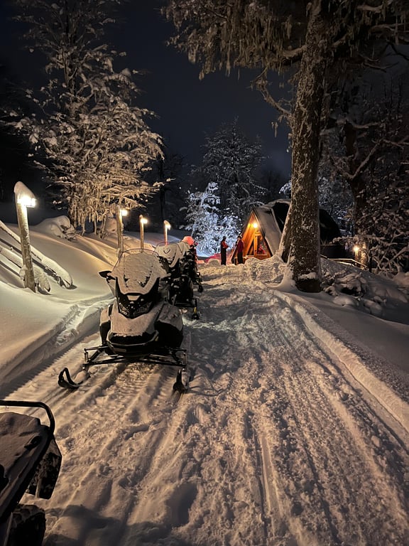 Em um ponto da subida, nossos guias estarão esperando por você para iniciar a viagem nos quadriciclos de esteira 4×4 CAN-AM Outlander de dois lugares ou nas motos de neve de dois lugares Ski-Doo Grand Touring Sport Ace (o uso de um veículo ou outro está sujeito às condições climáticas). Após uma conversa explicativa sobre o manuseio e colocação dos capacetes em nossa cúpula de recepção, iniciaremos o passeio por um bosque de faias.
