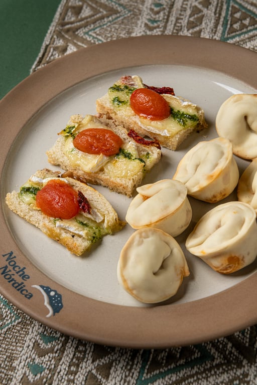 Empanadas de truta fumada, focaccia com queijo brie, tomate confitado e óleo de rúcula.