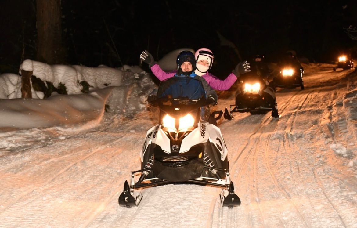 Passeio guiado de moto de neve no período noturno