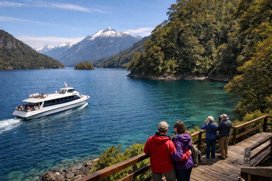 A experiência começa com trasporte saindo do centro para o embarque em Puerto Pañuelo, localizado na região do Llao Llao, onde os passageiros iniciam uma navegação confortável pelas águas cristalinas do lago, cercados por montanhas, florestas e paisagens típicas da Patagônia argentina.